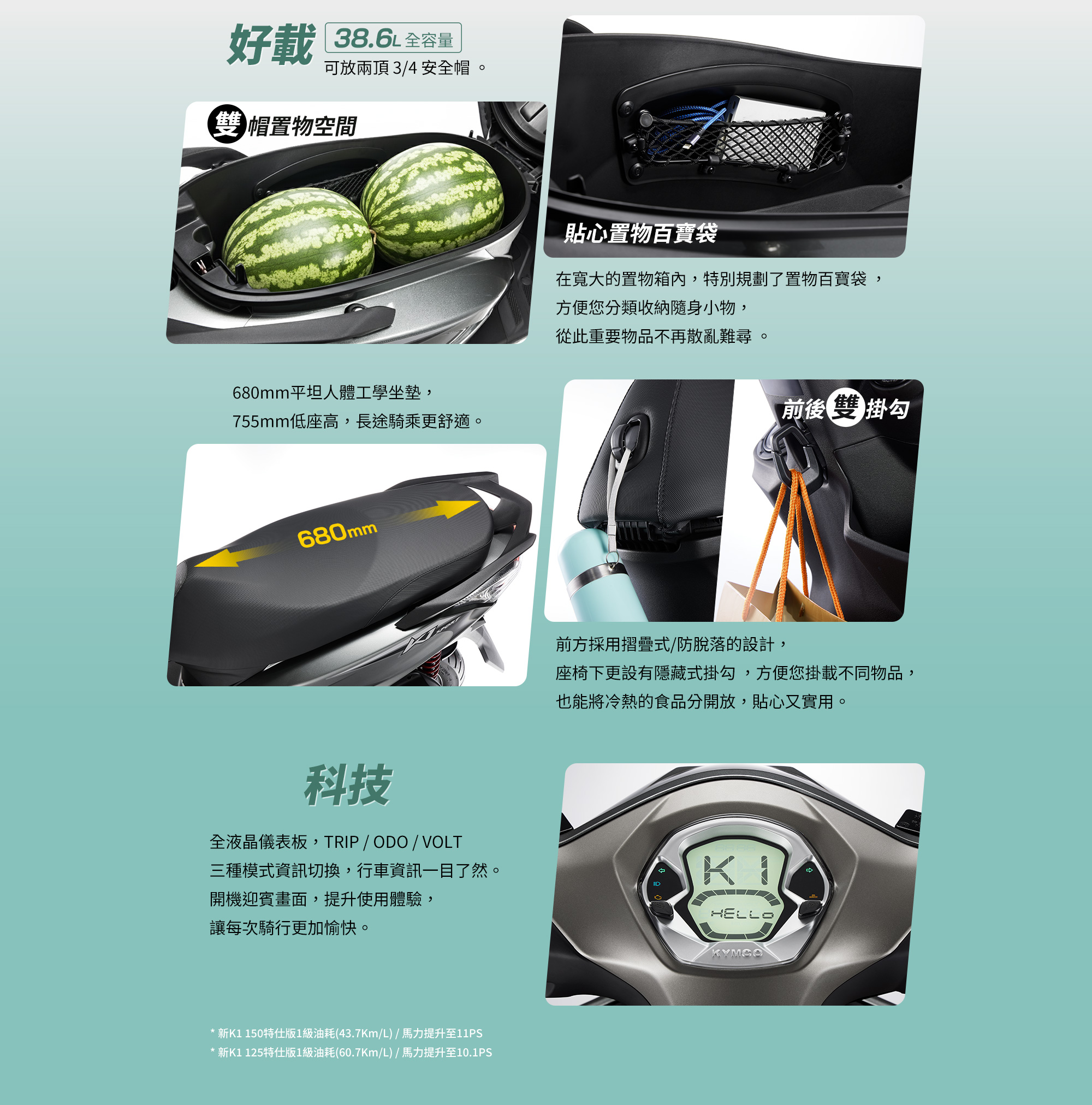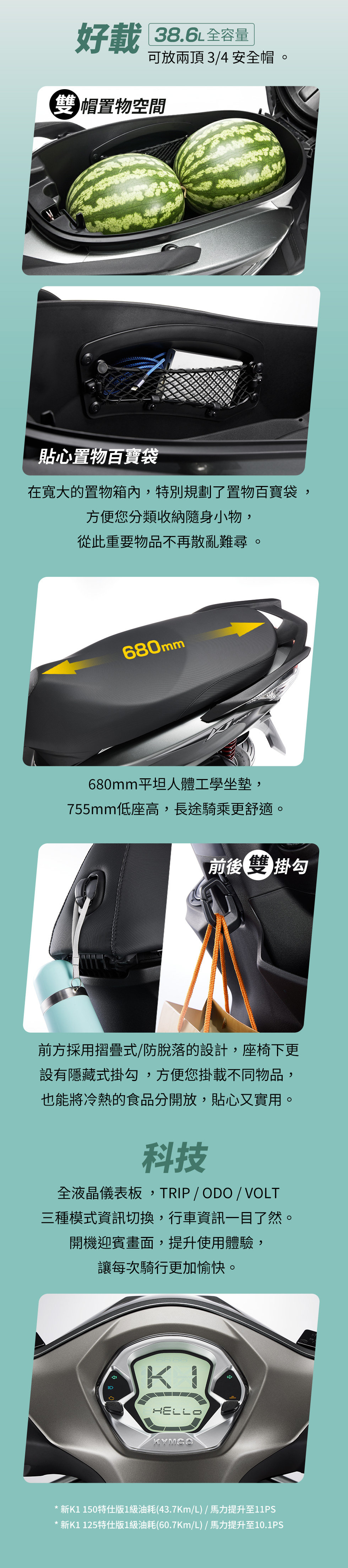 | 椅墊下全置物空間 | 38.6 L(兩頂 3/4 安全帽) | |