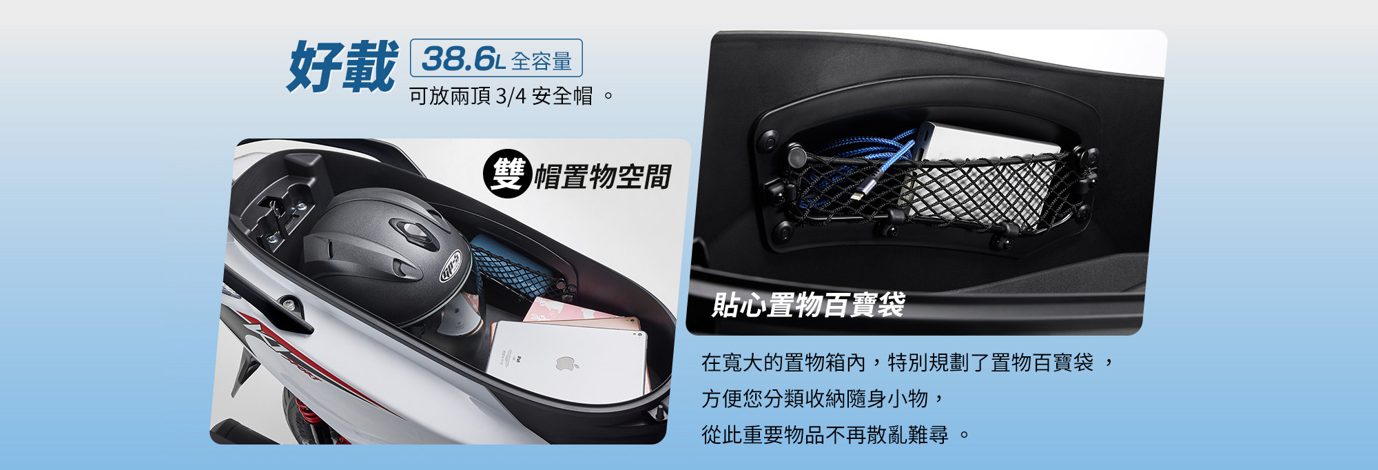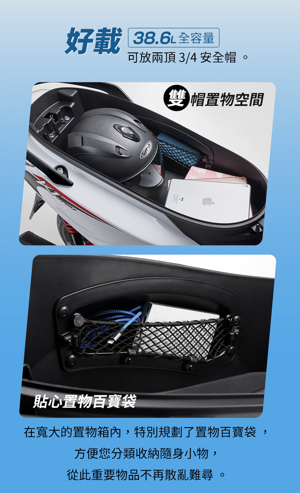椅墊下全置物空間 | 38.6 L(兩頂 3/4 安全帽) |
